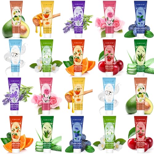 【20 PACK Hand Cream for Dry Cracked Hands】Shea Butter, Honey,Lavender,Rose,Orange,Tea Tree,Blueberry,Coconut,Aloe,Cherry Blossom,Milk,Avocado Chamomile,Jasmine. Pick and choose your favorite scent based on your mood at the moment from our 14 natural fragrances.