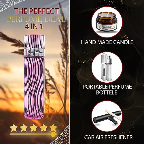 Hilton Perfume for Women – EDP Spray 3.4 Ounce – Gift Set Pack With Lavender Soy Candle, Car Air Fresheners, and Empty Travel Perfume Atomizer