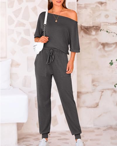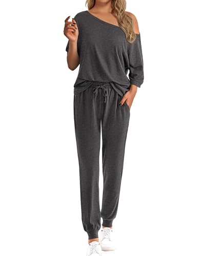 Zenlonr Women Summer 2 Piece Outfits 2024 Off Shoulder Short Sleeve Tops Elastic Waist Drawstring Long Pants Tracksuit