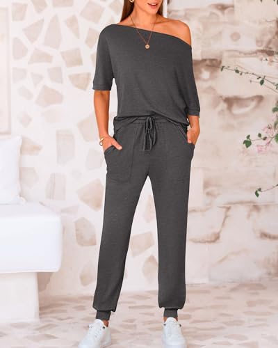 Specification: Zenlonr Women Summer 2 Piece Outfits 2024 Off Shoulder Short Sleeve Tops Elastic Waist Drawstring Long Pants Tracksuit