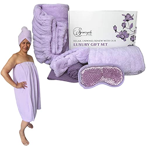 Specification: Samiyah & Co Purple Luxury Gift Set for Women – Soft Coral Fleece Bath Towel Set Plus Cooling Towels & Gel Bead Eye Mask – Care Package for Mom in Elegant Gift Box (OS/XL,Purple)