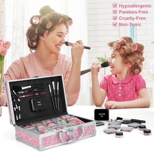 Anpro All-In-One Makeup Carry Case with Pro Teen Makeup Set, Full Starter Cosmetics Kit with Makeup Brushes, Lipsticks, Eye Shadows Palette, Blushes, Glitter Gel-Pink