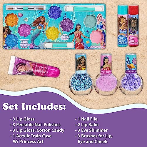 KIT INCLUDES: 1 acrylic train case w/ Princess art. 3 peelable, bubble gum scented nail polishes: purple confetti glitter, pink shimmer, and blue/silver confetti. 3 lip glosses in cotton candy flavor. 2 lip balms, cherry, and bubble gum flavored. 3 brushes for lip, eye and cheek shimmers. 3 eye shimmers. 2 cheek shimmers. 1 nail file and so much more!