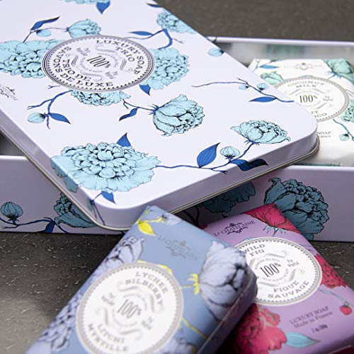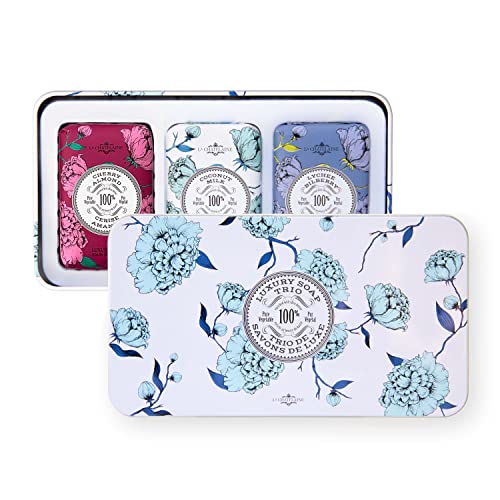 La Chatelaine Luxury Bar Soap Trio Gift Set Tin – Winter White | Made in France | Natural and Organic Soap Bars | Shea Butter Formula | 3 x 7 oz / 200g (Cherry Almond, Coconut Milk, Lychee Bilberry)