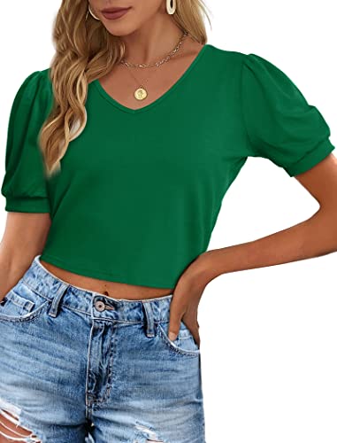 Aloodor Crop Tops for Women Puff Sleeve V Neck T Shirts S-XXL