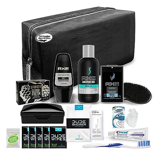 Kit Comprises: AXE 2in1 Shampoo+Conditioner 3 oz.., AXE Bar Soap 3.5 oz.., AXE Deodorant (packaging might range), Soap Dish, AXE Body Spray .57 oz.., Crest Toothpaste .85 oz.., Toothbrush Cap, Full Size Toothbrush, Dentek ADA Accepted Flossers 3 ct., Dude Shower Wipe 1 ct., Dude Flushable Wipes (5), Giovanni LA Natural Styling Gel Packet .25 oz.., Palm Scalp Brush, TSA Compliant Quart Size Zip Most sensible Bag, Black oblong zippered commute bag with take care of.