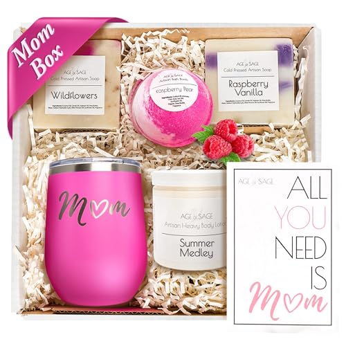 Spa Gift Box for Women, Self Care Spa Gift Set, Mom Spa Gift Basket, Ideal Gift for Mother’s Day, Spa Kit with Artisan Soaps, Lotion, Bath Bomb, Tumbler and Mom Greeting Card by Age of Sage