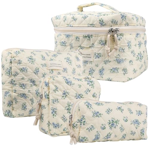 4Pcs Large Capacity Makeup Bag for Women, Cute Portable Quilted Coquette Aesthetic Floral Cosmetic Bag, Organizer Storage Travel Toiletry Bag (004-Blue Rose)