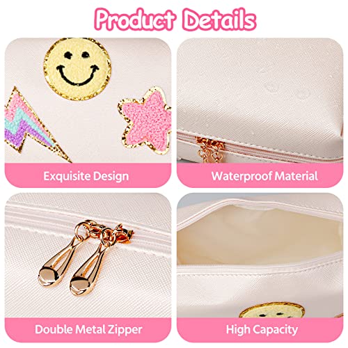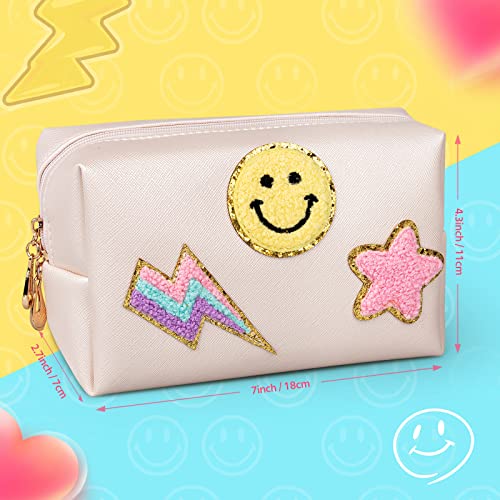 AgoKud Preppy Patch Makeup Bag PU Leather Waterproof Portable Toiletry Pouch Cosmetic Bag Daily Use Storage, Makeup Organizer Travel Essentials for Women Teen Girls Gift (Shell White)