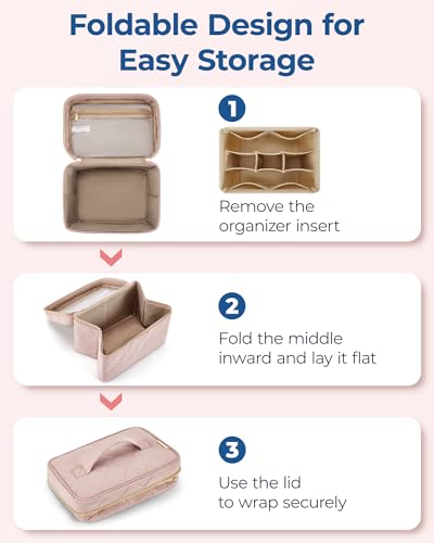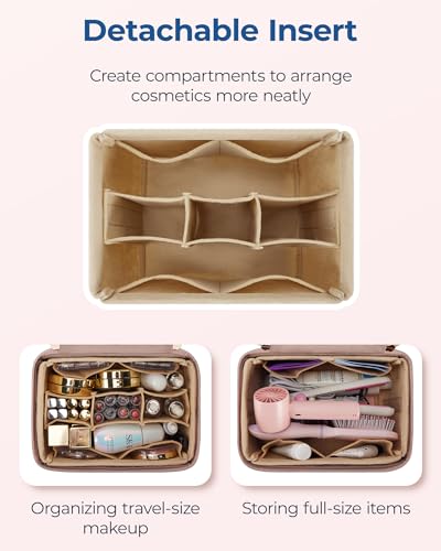 【Detachable Organizer Insert】The adjustable dividers keep your cosmetic accessories neat and well-organized. The insert can also be removed for laying oversized items such as hair dryers and curling irons. Additionally, it can also serve as a separate organizer for your household items, buying one bag equals two!