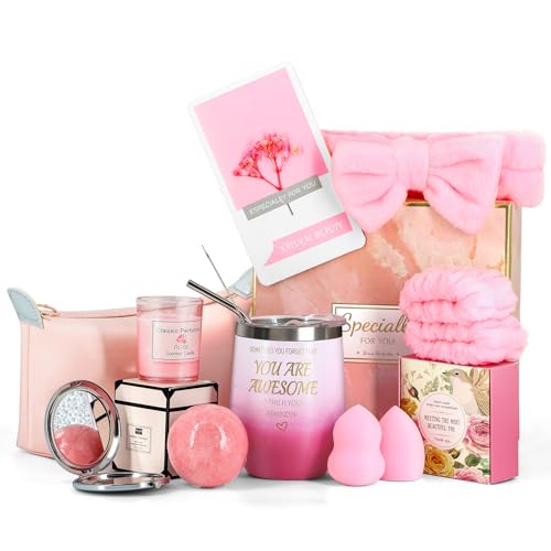 【An Unforgettable Unboxing】This birthday gifts basket for women contains 9 gifts beautifully packaged, 12-oz insulated stainless steel tumbler(1pc), pink rose bath bomb(1pc), miniature mirror(1pc), scented candlesa(1pc), beauty sponges(2pcs), wristbands(2pcs), headband(1pcs), greeting card(1pcs), cosmetic bag(1pcs). This rich collection of gifts will not disappoint her.