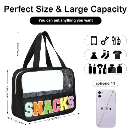 Specification: Chenille Letter Patch Clear Bag,Preppy Multi-purpose PVC&Nylon Clear Makeup Bag with Handles,Large Travel Makeup Toiletry Storage Zipper Pouch, Tote Bag for Women (Black-SNACKS)