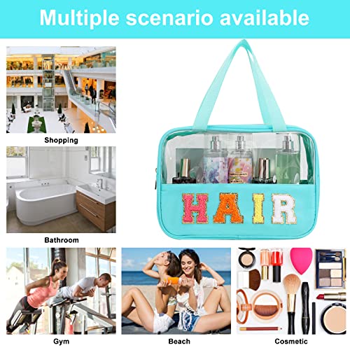 Chenille Letter Patch Clear Bag,Preppy Multi-purpose PVC&Nylon Clear Makeup Bag with Handles,Large Travel Makeup Toiletry Storage Zipper Pouch, Tote Bag for Women (Mint-HAIR)