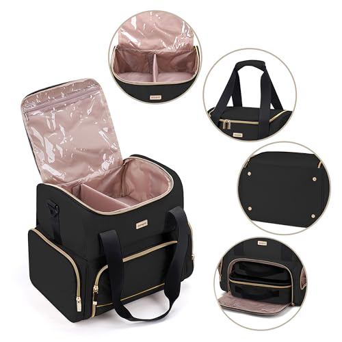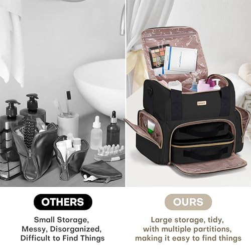 LARGE CAPACITY: Dimensions 14.2×9.1×11.8in. The travel cosmetic case features double-layer design and multiple storage to organize your all cosmetics. Top compartment comes with detachable dividers for convenient customization to your storage needs.