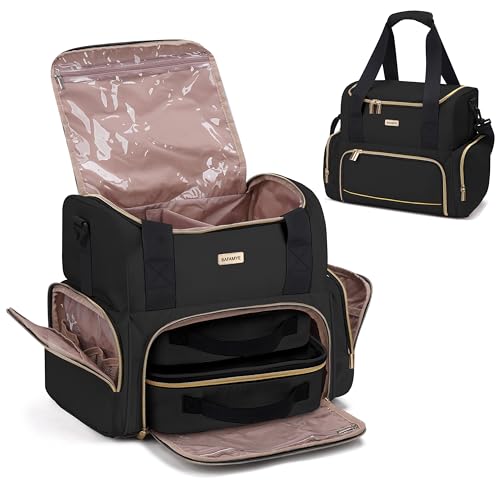 LARGE CAPACITY: Dimensions 14.2×9.1×11.8in. The trip cosmetic case features double-layer design and a couple of storage to organize your all cosmetics. Top compartment comes with detachable dividers for convenient customization to your storage needs.