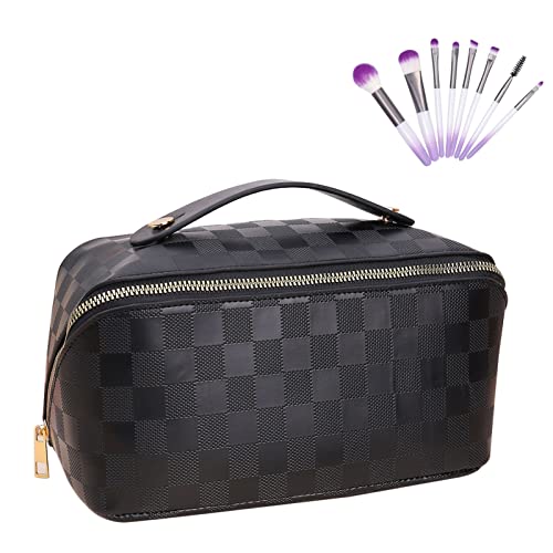 New Version Travel Cosmetic Bag, Makeup bag with 8PCS Burshes Waterproof Portable with Handle and Divider Skincare Bag, PU Leather Large Capacity Hanging Toiletry Bag-Black Plaid