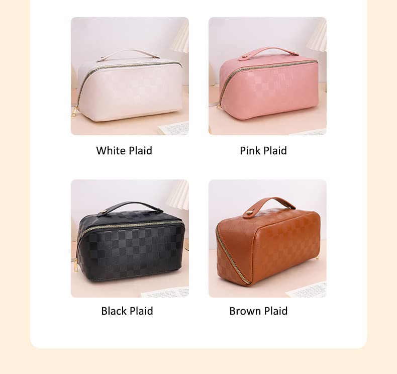 Specification: New Version Travel Cosmetic Bag, Makeup bag with 8PCS Burshes Waterproof Portable with Handle and Divider Skincare Bag, PU Leather Large Capacity Hanging Toiletry Bag-Black Plaid