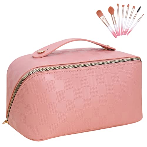 New Version Travel Cosmetic Bag, Makeup bag with 8PCS Burshes Waterproof Portable with Handle and Divider Skincare Bag, PU Leather Large Capacity Hanging Toiletry Bag-Pink Plaid