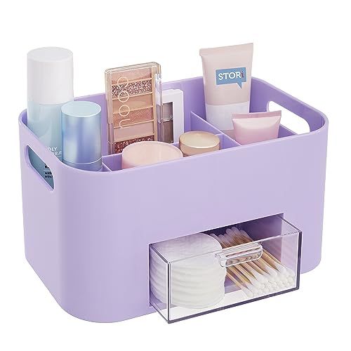 STORi Bliss 4-Compartment Plastic Vanity Organizer with Small Accessory Drawer in Lilac Purple | Rectangular Makeup, Skincare, & Cosmetic Storage Bin with Pass-Through Handles | Made in USA