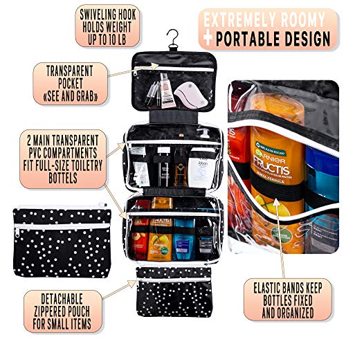 Large Travel Hanging Toiletry Bag For Women – Folding Bathroom Toiletry Cosmetic Organizer – XL Hanging Travel Bag For Full Size Toiletries (black polka dot)