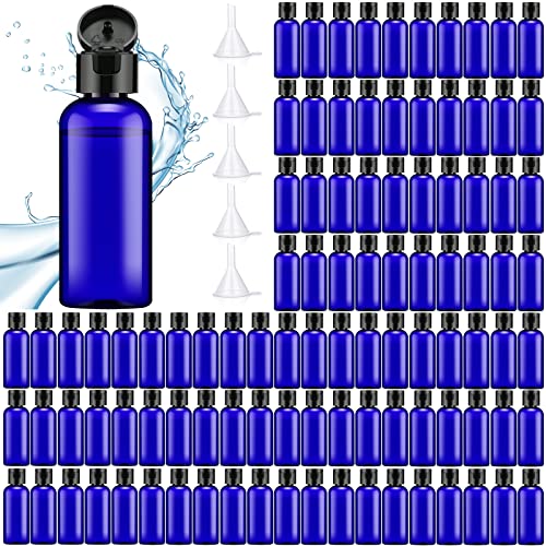 Specification: 100 Pack 2 oz Plastic Empty Bottles with Flip Cap Travel Size Containers with Flip Cover Cap Plastic Squeeze Bottles Refillable Dispensing Bottles with 5 Funnels Liquid Lotion for Travel (Blue)