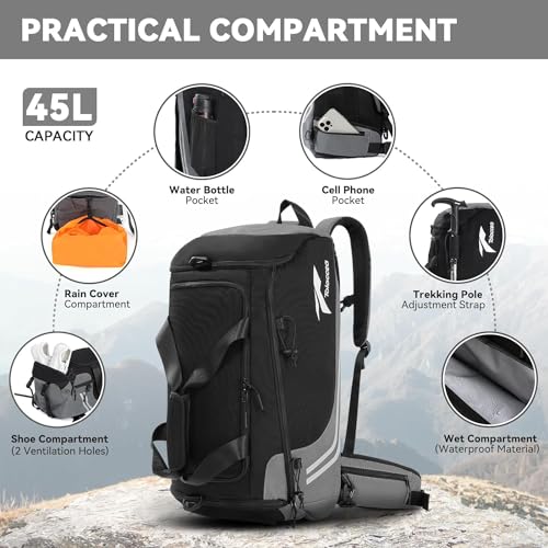 Specification: Tolaccea Gym Bag for Men, 45L Travel Duffel Bag, Weekender Bags, Carry on Backpack with Wet Pocket & Shoes Compartment, Sport Duffel Bag for Workout, Hiking, Cli