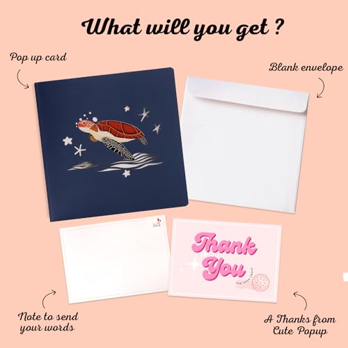 🐢LOVELY SIZE – The turtle thank you cards have a size of 6 x 6 inches. All components are laser cut and delicately assembled by hand. These 3d pop-up cards include white shining envelopes, especially message tags attached to write your warm wishes, messages, and notes beef up the elegance of the most efficient friend pop up cards