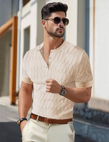 Men’s Knit Polo Shirts Short Sleeve Texture Henley Shirts Knitted T-Shirts Casual Lightweight Golf Shirts