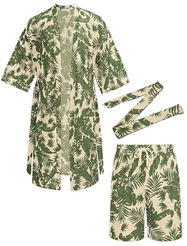 COOFANDY Men Lightweight 2 Piece Kimono Robe with Shorts Japanese 3/4 Sleeve Robes Casual Open Front Long Cardigan With Belt