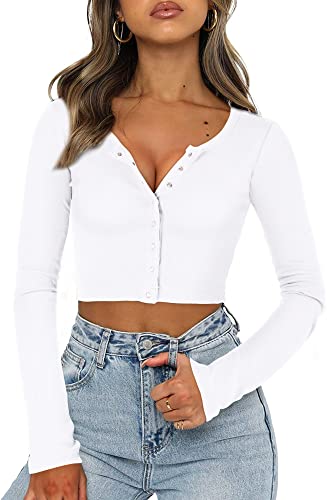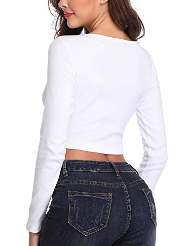 FENSACE Womens Button Down Long Sleeve Crop Top Basic Knit Slim Fit T-Shirt XS-XL