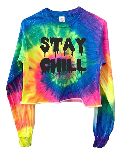 STAY CHILL drippy graphic design on a soft, one hundred% cotton, neon rainbow tie-dyed, cropped, long sleeve unisex t-shirt. All of our crop tops are silk screened for the best quality conceivable. These tops have just been cropped, so after being washed and dried, they are going to roll up reasonably on the bottom. Please note: Each and every tie-dyed tee is hand dyed and reasonably unique. Washing instructions: Machine wash inside out in very cold water, dry generally. Slight fading might happen.