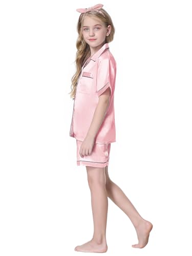 Schbbbta Girls 3 Pieces Pajamas Sets Silk Satin Sleepwear Button Down Short Sleeve Pjs Outfits