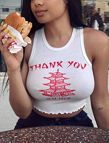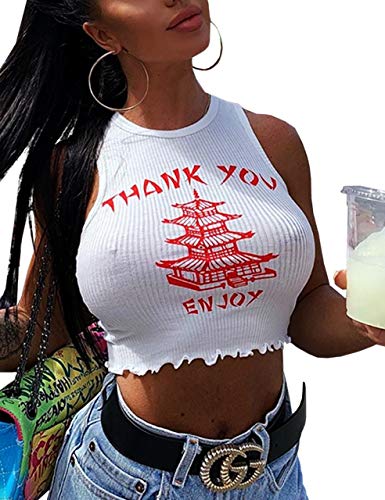 SAFRISIOR Women Sexy Thank You Enjoy Printed Tower Graphic Skinny Slim Streetwear Sleeveless Crop Tank Top