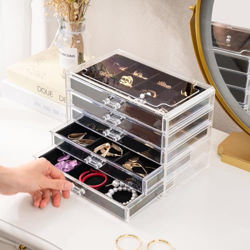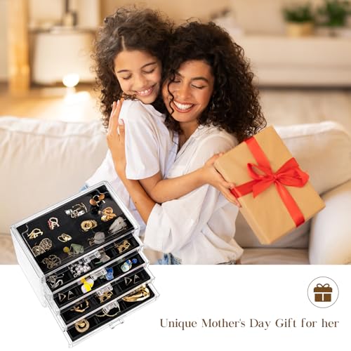 Earring Holder Organizer Jewelry Box with 5 Drawers Mothers Day Gift, Acrylic Clear Earring Case with Adjustable Velvet Trays for Women – Black, 5 Layers