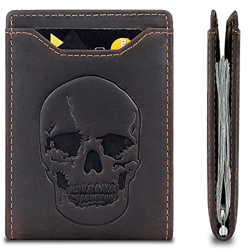Specification: DK86 Men’s Leather Skull Slim Wallet with Money Clip Minimalist Bifold Front Pocket wallet for Men RFID Blocking Full Grain Leather (Coffee Skull)