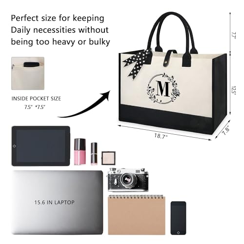 BeeGreen Monogram Initial Canvas Bag with Inner Zipper Pocket Embroidery Personalized Tote for Mom Teacher Friend