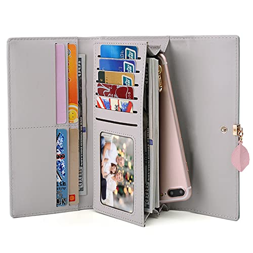 UTO Wallet for Women PU Leather Leaf Pendant Card Holder Phone Checkbook Organizer Zipper Coin Purse