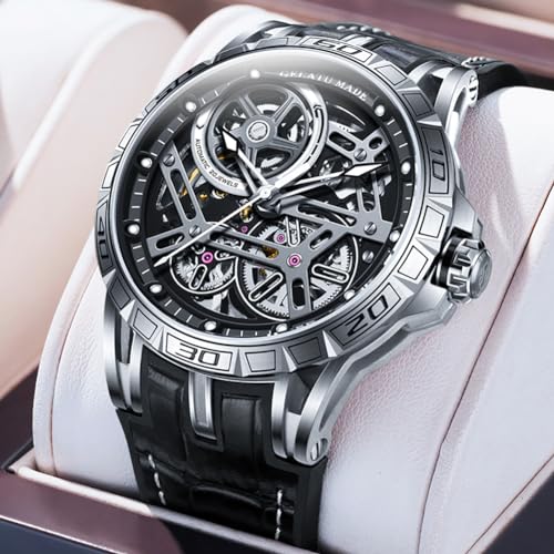 OUPINKE Skeleton Mens Watches Automatic Mechanical Luxury Watch Sapphire Crystal Leather Band Waterproof Luminous Dress Wristwatch