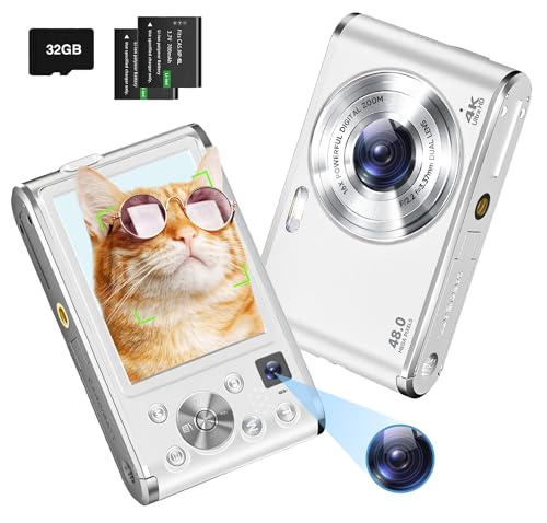 4K Digital Camera, 48MP Autofocus Kids Camera Selfie with Front and Rear Dual Lenses, 32GB Card, 2 Batteries, 16X Digital Zoom, Compact Travel Vlogging Video Camera Gift for Kid Teen Beginner(White)