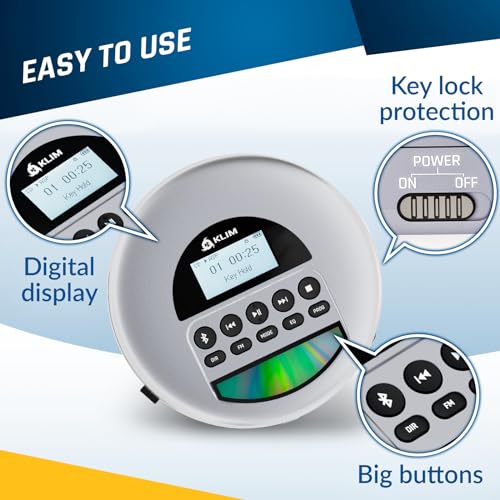 KLIM Nomad – New Version – Portable CD Player Walkman with Long-Lasting Battery – with Headphones – Radio FM – Compatible MP3 CD Player Portable – TF Card Radio FM Bluetooth – Ideal for Cars – Grey