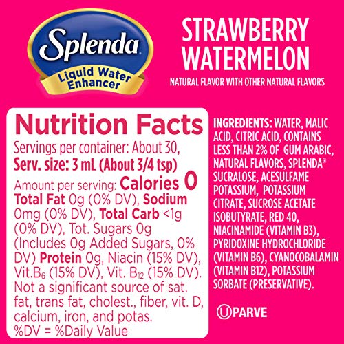 Specification: SPLENDA Liquid Water Enhancer Drops, Sugar Free, Zero Calorie, Natural Flavor, Concentrated Drink Mix, 3.11 Fl Oz Each Bottle (Strawberry Watermelon, 2 Pack)