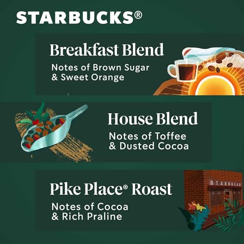 STARBUCKS MEDIUM ROAST VARIETY—From the notes of toffee and dusted cocoa of Starbucks House Blend coffee to the cocoa and rich praline notes of Starbucks Pike Place Roast coffee to Starbucks Breakfast Blend coffee’s brown sugar and sweet orange notes, Starbucks coffees feature tastes that are ideal for each day