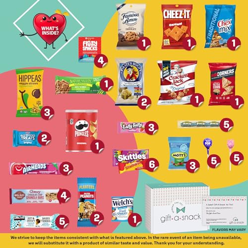 AMERICA’S FAVORITE SNACKS AND CANDIES: The “Gift A Snack” Snack Variety Pack contains America’s favorite snacks and candies such as Airheads Gravity Feed, Cheez It, Chex Mix, Dum Dums, Famous Amos Chocolate Chip, Hippeas Rockin Ranch Veggie Straws, Hippeas Sour Cream & Onion Veggie straws, Kirkland Signature Soft & Chewy Granola Bars, Laffy Taffy and much more!