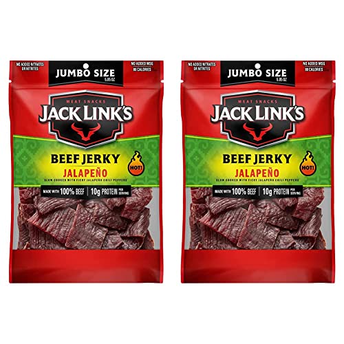 Jack Link’s Beef Jerky, Jalapeno, Spicy Meat Snack – Made with a Hint of Jalapenos and Red Chiles, 10g of Protein, 80 Calories, Made with Premium Beef, 5.85oz (Pack of 2)
