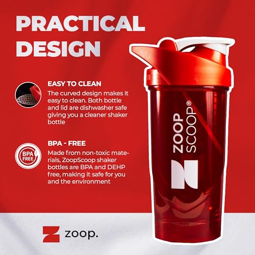 EASY TO CLEAN – the ZoopScoop blender bottle’s curved base design makes for easier cleaning, and both bottle and lid are dishwasher secure. This implies no more powder residue build up, giving you a cleaner more hygienic shaker bottle.