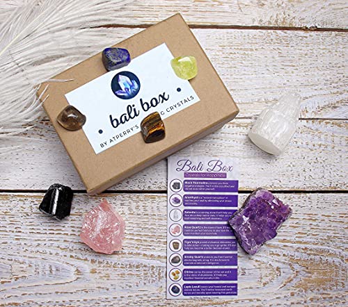 AtPerry’s Bali Box – Healing Crystals Set – 8 Natural Chakra Crystals Tumbled & Raw Including Selenite, Amethyst, Lapiz Lazuli & Black Tourmaline