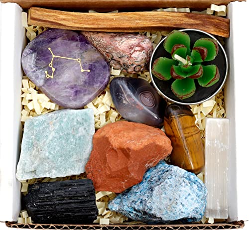 Specification: DANCING BEAR Leo Zodiac Healing Crystals Gift Set (14 Pc): 9 Stones, 18K Gold-Plated Constellation Necklace, Meteorite, Succulent Candle, Palo Santo Smudge Stick, and Info Guide, Made in The USA