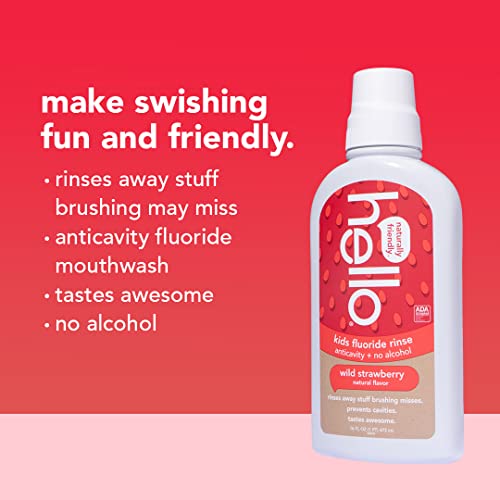 Hello Kids Wild Strawberry Natural Flavor Anticavity Fluoride Rinse – Vegan, Alcohol Free, and SLS Free Mouthwash for Children Age 2 and Up – 16 Ounce (Pack of 3)