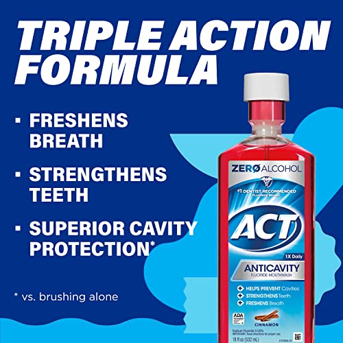 Contains one (1) 18 fluid ounce bottle of ACT Anticavity Zero Alcohol Fluoride Mouthwash Cinnamon Flavor