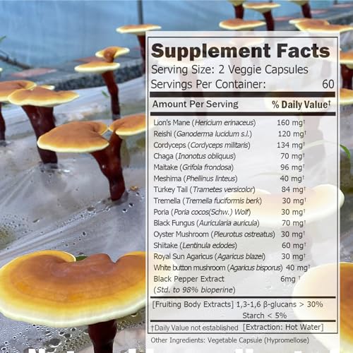 Specification: 14 Mushrooms Supplement 120 Capsules – Immune System Booster & Nootropic Brain Supplement – with Lion’s Mane, Reishi, Maitake, Turkey Tail, Chaga Complex – Black Pepper for Absorption, 30% Beta-Glucan